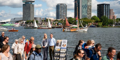 Nogle af de over 2 millioner besøgende ved SAIL Amsterdam går forbi et par der står med standene ved havnefronten IJ.