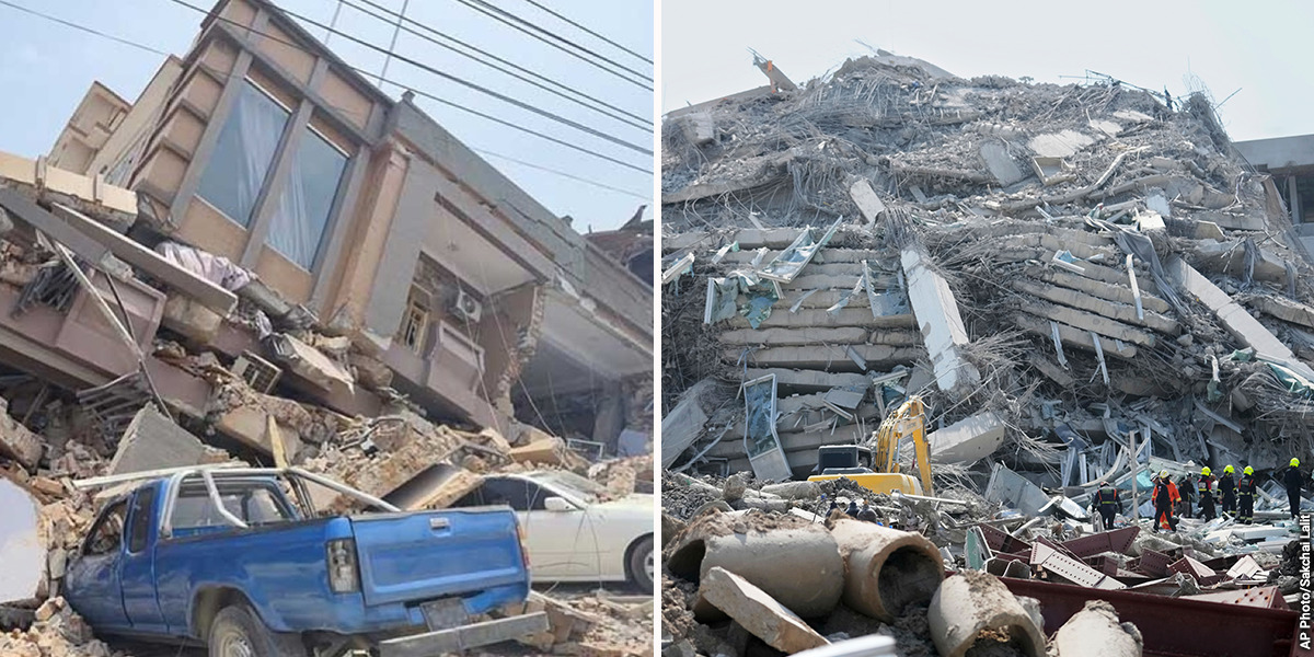 Edificios destruidos tras el terremoto del 28 de marzo de 2025 en Myanmar (izquierda) y Tailandia (derecha).