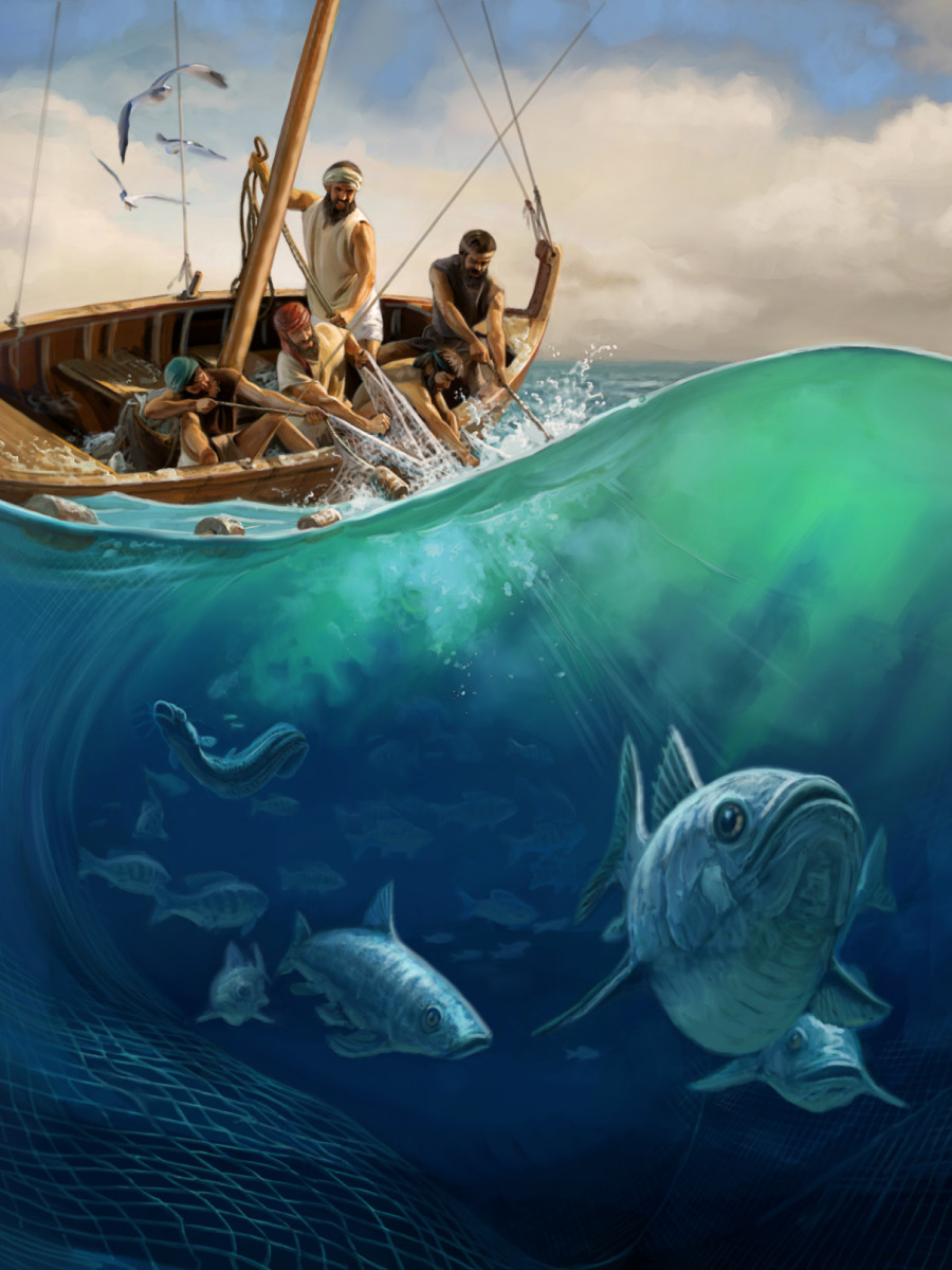17, 18. Mitä nuottavertauksessa merkitsevät a) nuotan laskeminen, b) ”kaikenlaisen kalan” kokoaminen, c) hyvien kalojen kerääminen astioihin ja d) kelpaamattomien kalojen heittäminen pois?