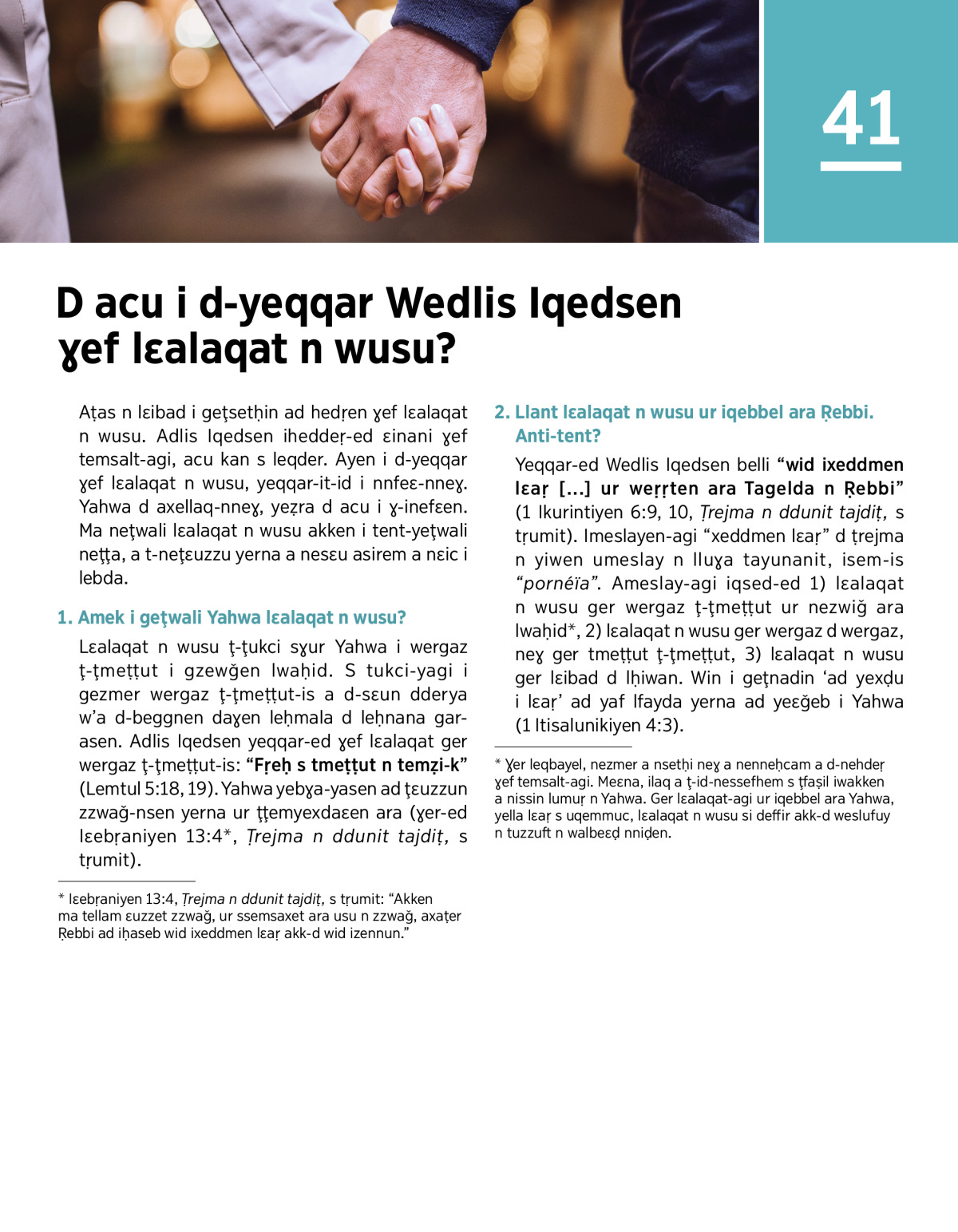 “D acu i d-yeqqar Wedlis Iqedsen ɣef wergaz ţ-ţmeṭṭut yeţɛicin lwaḥid bla ma zewǧen?” (di jw.org)