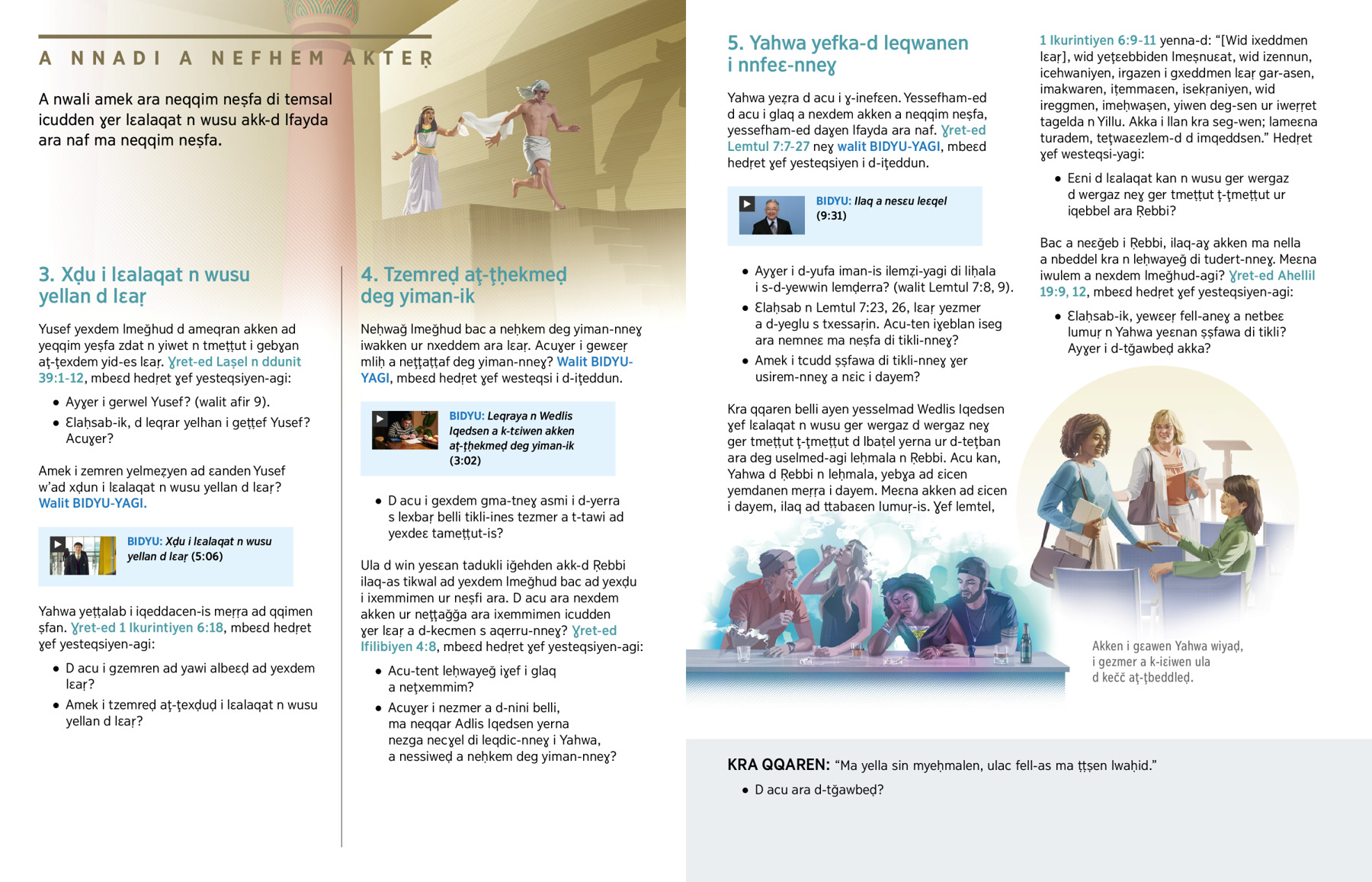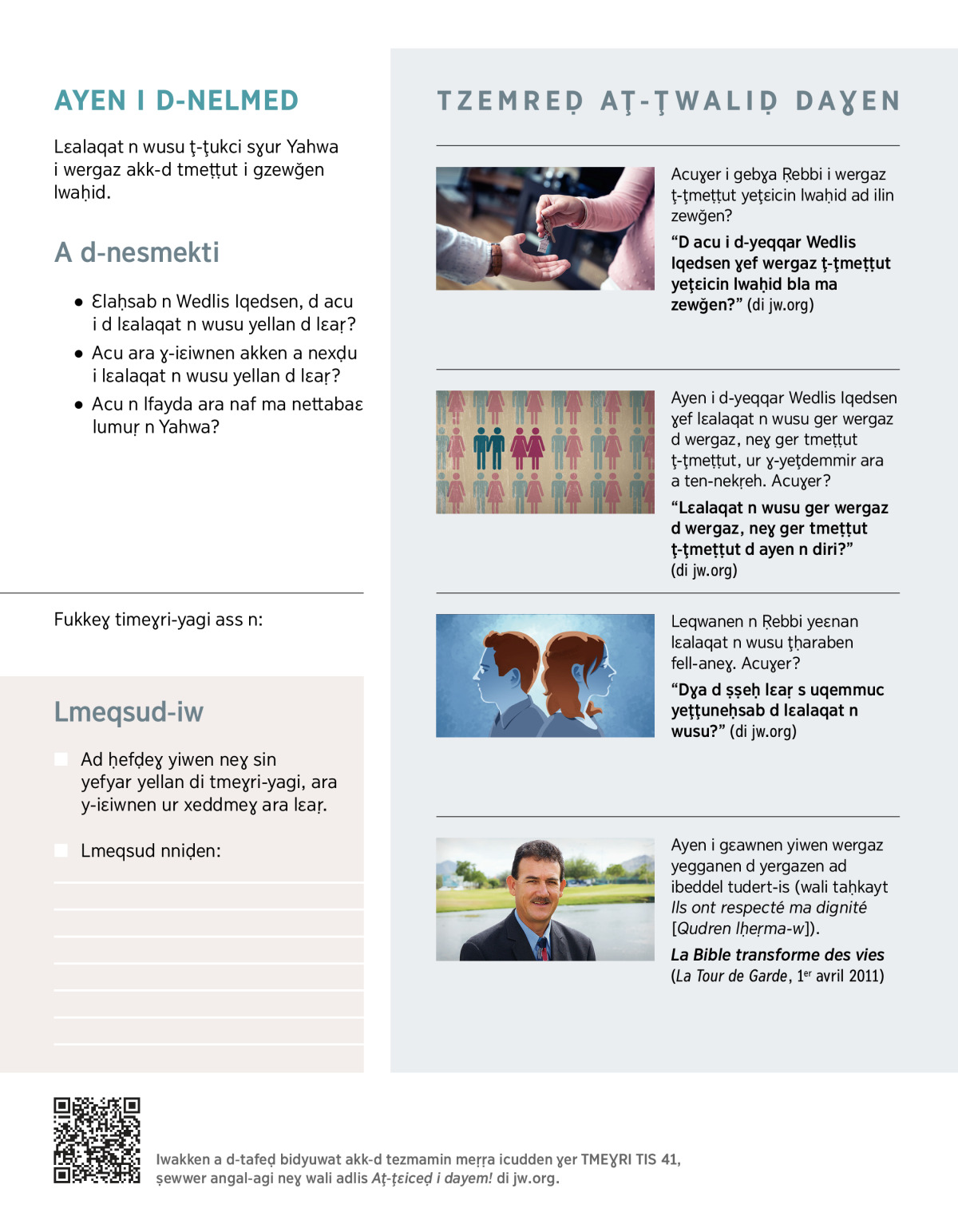 “Lɛalaqat n wusu ger wergaz d wergaz, neɣ ger tmeṭṭut ţ-ţmeṭṭut d ayen n diri?” (di jw.org)