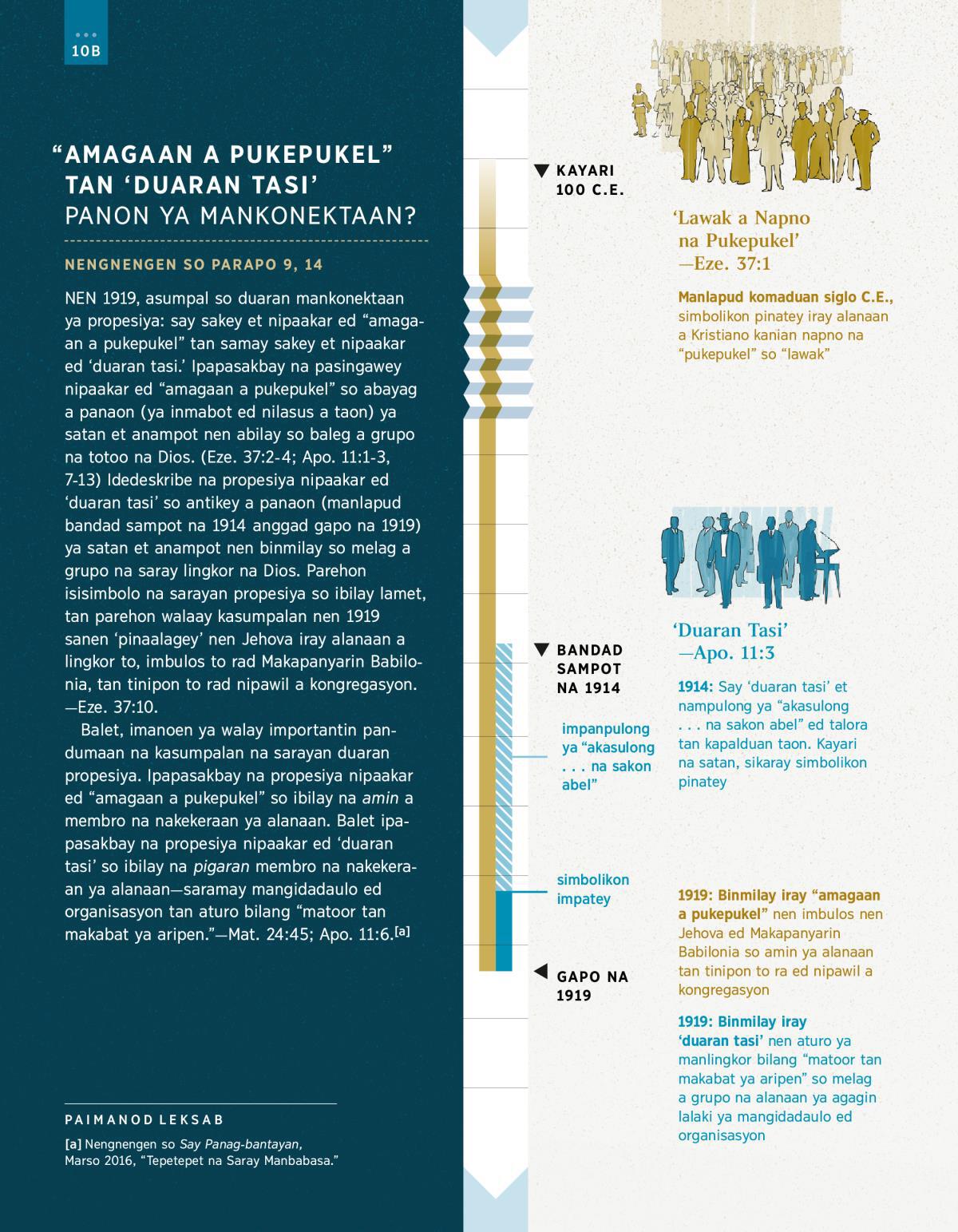 NEN 1919, asumpal so duaran mankonektaan ya propesiya: say sakey et nipaakar ed “amagaan a pukepukel” tan samay sakey et nipaakar ed ‘duaran tasi.’ Ipapasakbay na pasingawey nipaakar ed “amagaan a pukepukel” so abayag a panaon (ya inmabot ed nilasus a taon) ya satan et anampot nen abilay so baleg a grupo na totoo na Dios. (Eze. 37:2-4; Apo. 11:1-3, 7-13) Idedeskribe na propesiya nipaakar ed ‘duaran tasi’ so antikey a panaon (manlapud bandad sampot na 1914 anggad gapo na 1919) ya satan et anampot nen binmilay so melag a grupo na saray lingkor na Dios. Parehon isisimbolo na sarayan propesiya so ibilay lamet, tan parehon walaay kasumpalan nen 1919 sanen ‘pinaalagey’ nen Jehova iray alanaan a lingkor to, imbulos to rad Makapanyarin Babilonia, tan tinipon to rad nipawil a kongregasyon.—Eze. 37:10.