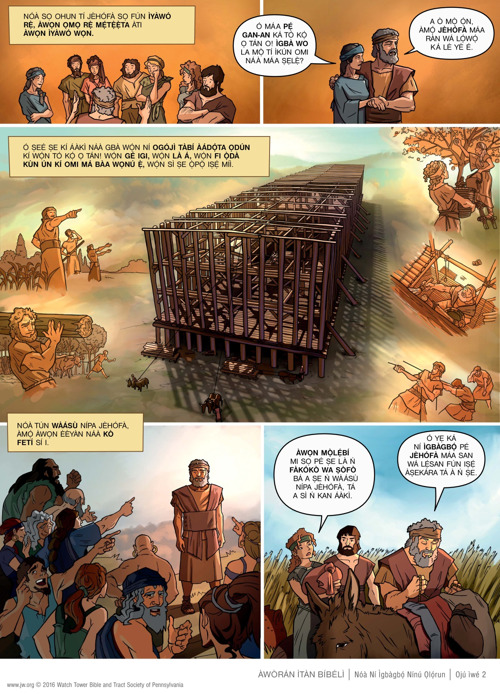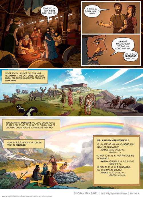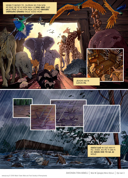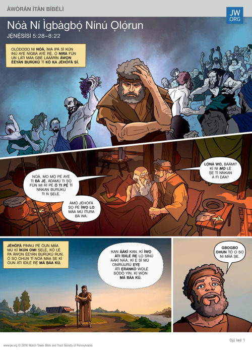 Kẹ́kọ̀ọ́ nípa Nóà, ẹni tó kọ́ áàkì ńlá kan kó lè gba ìdílé rẹ̀ àtàwọn ẹranko là. Ka ọ̀rọ̀ inú àwòrán ìtàn Bíbélì yìí lórí ìkànnì wa tàbí kó o tẹ̀ ẹ́ jáde.
